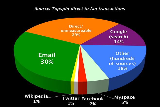 A simple figure: 30% of artists’ income using Direct to Fans Topspin platform comes from an email. Http://tinyurl.com/ydjb7cq.