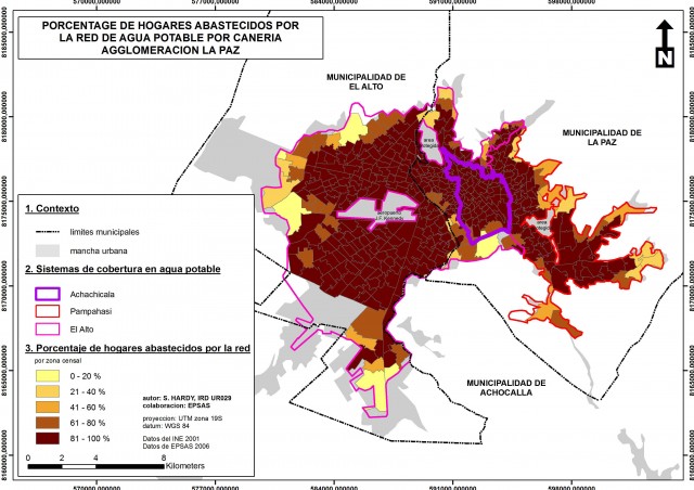 Carte de La Paz: pourcentage de foyers disposant de l’eau potable par canalisation par ©Sébastien Hardy
