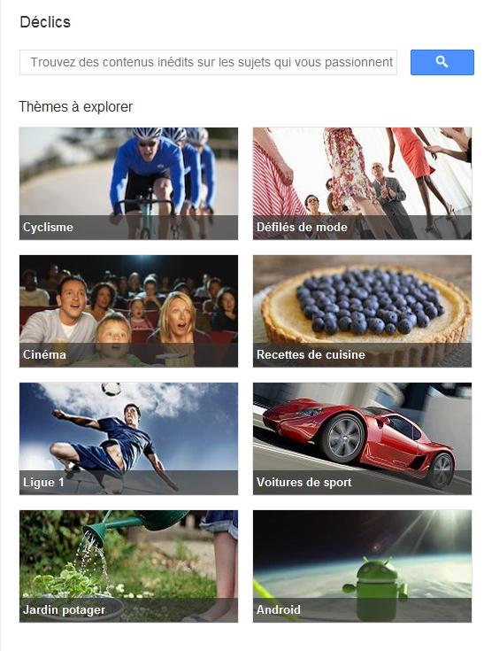 Le réseau social de Google peut ainsi être utilisé de la même manière que Twitter, la limite des 140 caractères en moins. Preuve en est de la partie « Déclics » (ou Spark), qui permet de se tenir informer sur des sujets particuliers, avec une pré-sélection d’informations. On choisit un sujet (Série TV, Cinéma, Sorties VTT, Pedobear…), et les articles d’actualité sur cette cible remontent automatiquement dans le flux d’informations.
