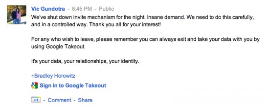 Cette fois-ci, il ne s’agit pas de se précipiter, mais bien de proposer aux intéressés de tenter la bêta Google +. A ce stade, le plus dur reste encore d’y être invité. Car malgré ce statut de service en cours de développement, théoriquement buggé et incomplet donc, les demandes d’accès ont été si nombreuses que Google s’est vu dans l’obligation de ralentir la cadence, comme l’explique Vic Gundotra, vice-président de la division Engineering pour Google :