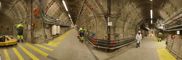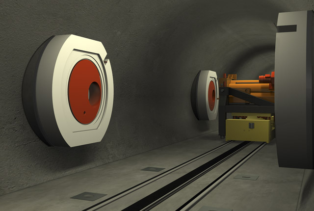 Vue de la future galerie d’accès aux alvéoles de stockage de déchets de haute activité (les alvéoles sont dans derrière les portes circulaires rouges) ©ANDRA