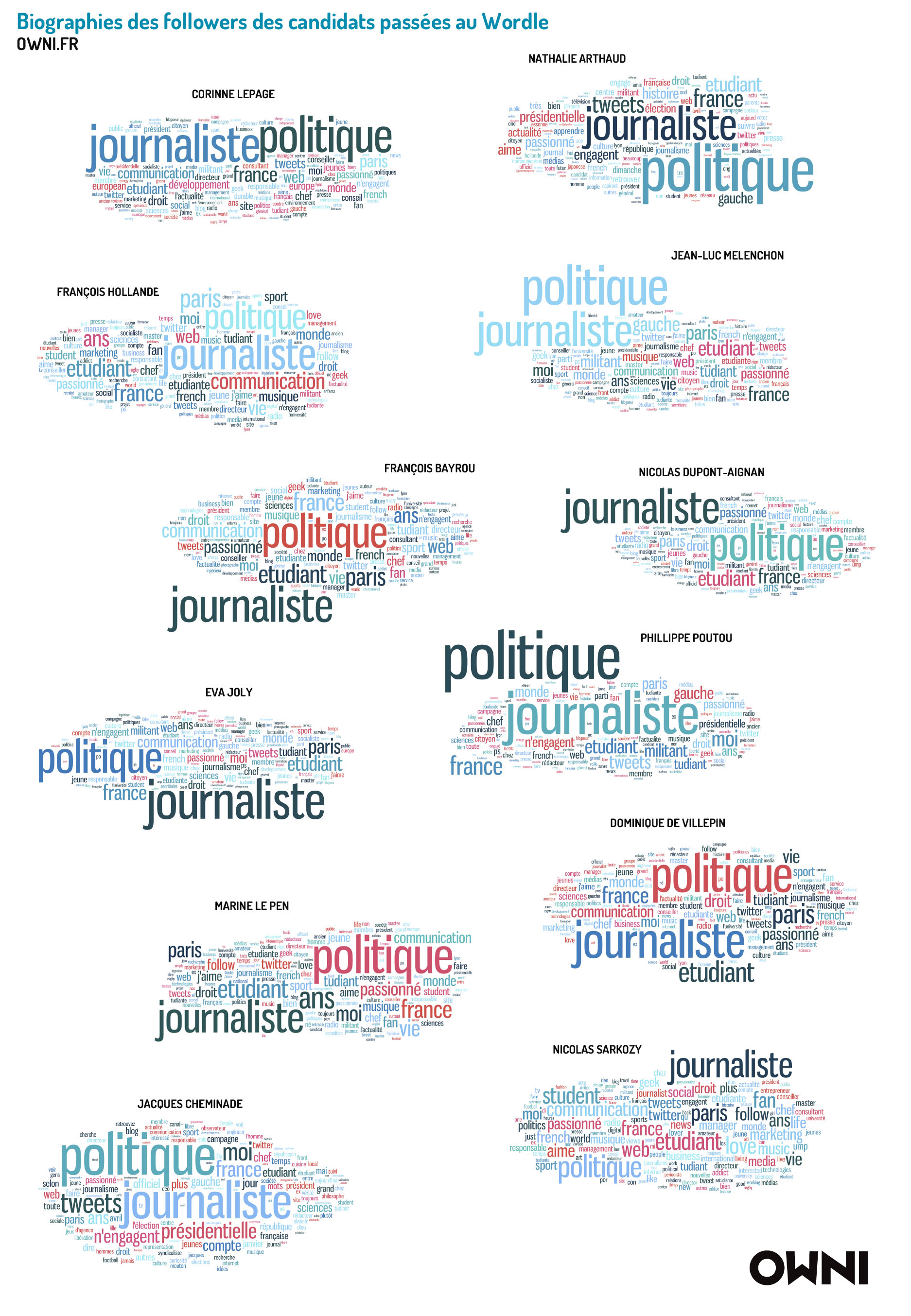 Passés à la moulinette Wordle , les biographies renseignées par les followers des différents candidats laissent apparaître une sémantique propre à chacun. Que nous laissons ouverte à l’analyse et au commentaire !