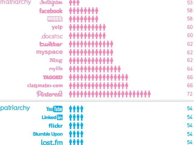 Autre œil mouillé jeté sur l’humanité, c’est celui du dieu vivant de la visualisation de données, David McCandless, qui nous pond (avec sa glorieuse équipe) en ce joli mois de mai (où les feuilles volent au vent si jolie mignonne) une infographie sobrement intitulée “Les meufs règnent-elles ?” – ou : l’équilibre des genres sur les réseaux sociaux. On y constate de prime abord, grâce au travail de recherche effectué par Dan Hampson et avec l’aide additionnelle de Piero Zagami et Tatjana Dubovina à la palette, que les filles sont plus présentes que les mecs sur Facebook, Twitter, Instagram ou Pinterest – pour ne citer que les plus connus – tandis que l’inverse s’applique sur Spotify, Google+, Flickr ou YouTube. Et qu’en tout, c’est presque 100 millions d’utilisatrices supplémentaires chaque mois qui se connectent sur les réseaux sociaux, et qu’elles sont davantage dans une logique d’échange que de consommation. Mais c’est une interprétation personnelle, chacun pourra jouer avec la source pour se faire la sienne.