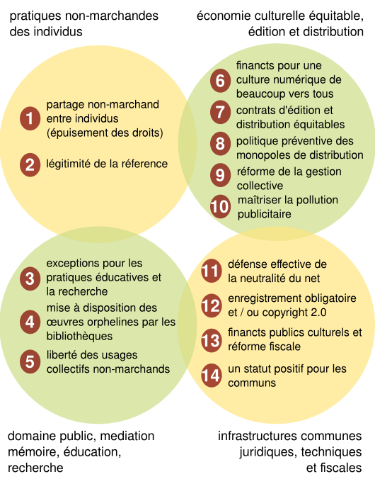 Articulé en 14 points représentés sur le schéma ci-dessous, ce texte couvre de nombreuses problématiques liées à la question de la création dans l’environnement numérique, aussi bien dans sa dimension juridique qu’économique et technique.